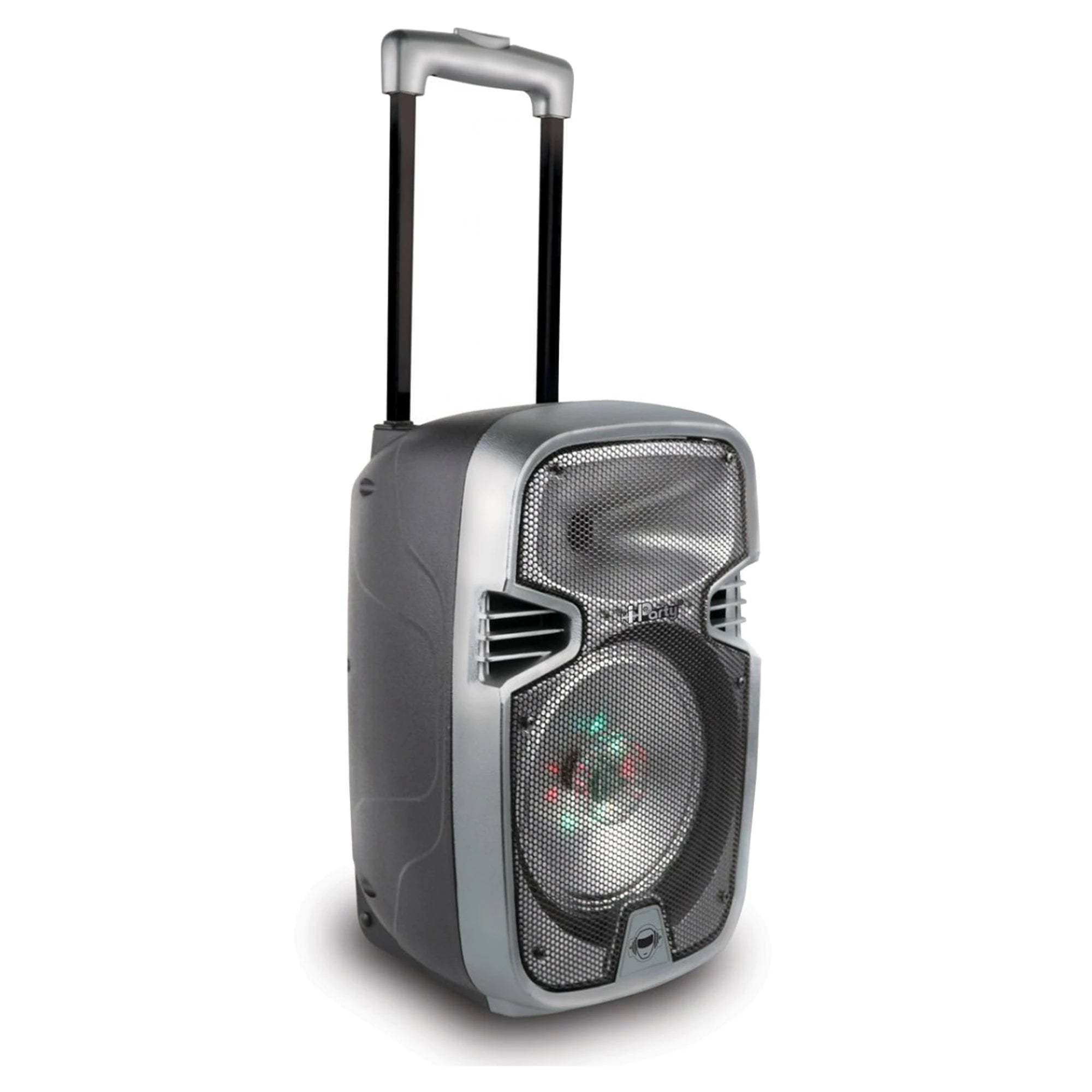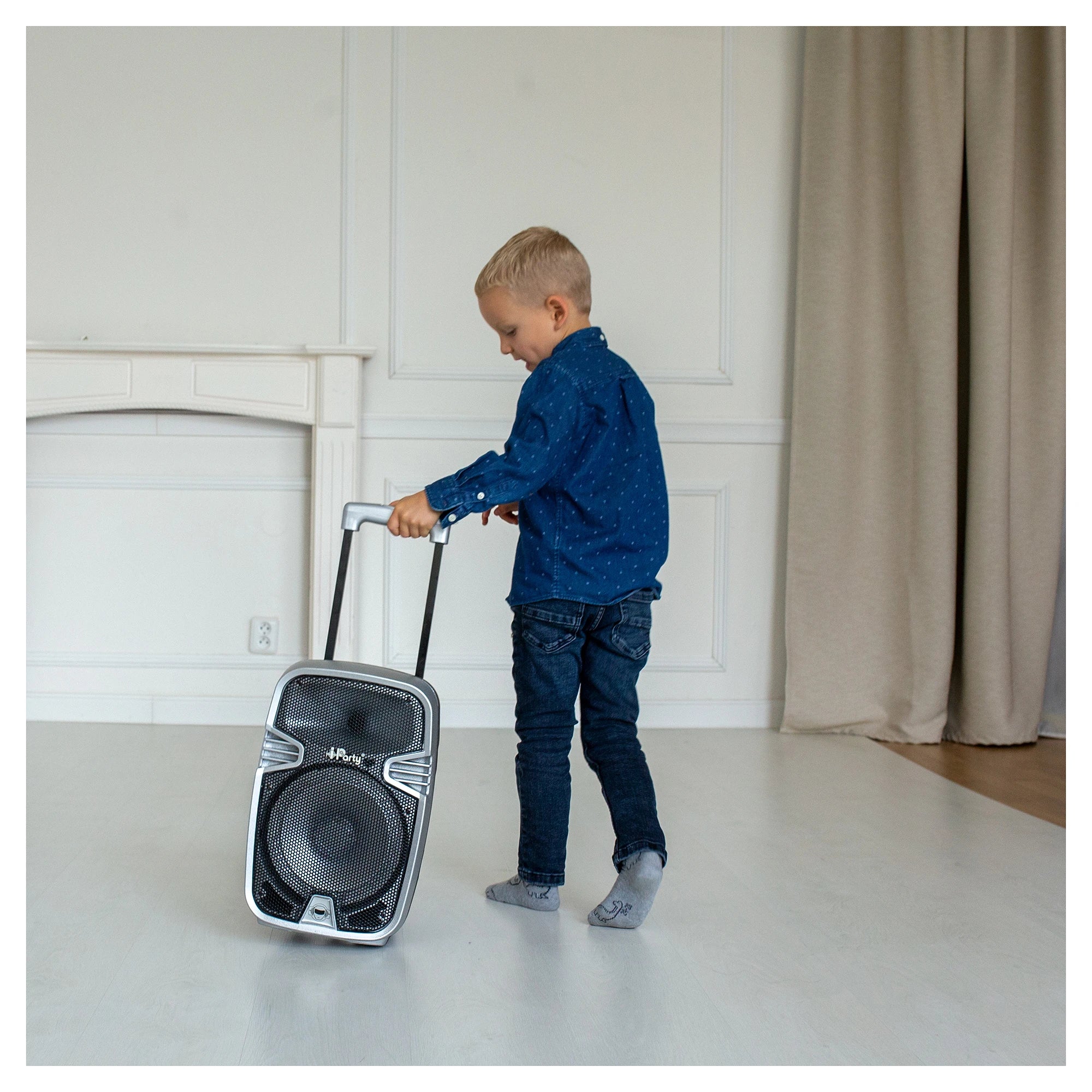 Bezdrátový audio systém s 18 hudebními watty rozjede vysoce kvalitní zvuk. Díky možnosti nastavení basů, výšek a ovládání ekvalizéru lze hudbu doladit k požadovanému hudebnímu stylu. Součástí balení je mikrofon s funkcí ozvěny, který promění reproduktor v karaoke zařízení – stačí jej zapojit do 6,3mm konektoru Aux-in. Reproduktor se snadno bezdrátově připojí ke všem zařízením vybaveným technologií Bluetooth®, například ke smartphonu nebo tabletu. Je také vybaven 3,5mm konektorem Aux-in (kabel je součástí balení) pro připojení dalších audio zařízení, USB portem a slotem pro paměťové micro karty typu SD/TF (USB disk, karty ani audio zařízení nejsou součástí balení). Reproduktor je vybaven vícebarevnými blikajícími LED světly, které přifouknou skvělou hudební atmosféru. Díky teleskopické rukojeti a integrovaným kolečkům tahle párty bedýnka putuje kamkoli bez námahy!