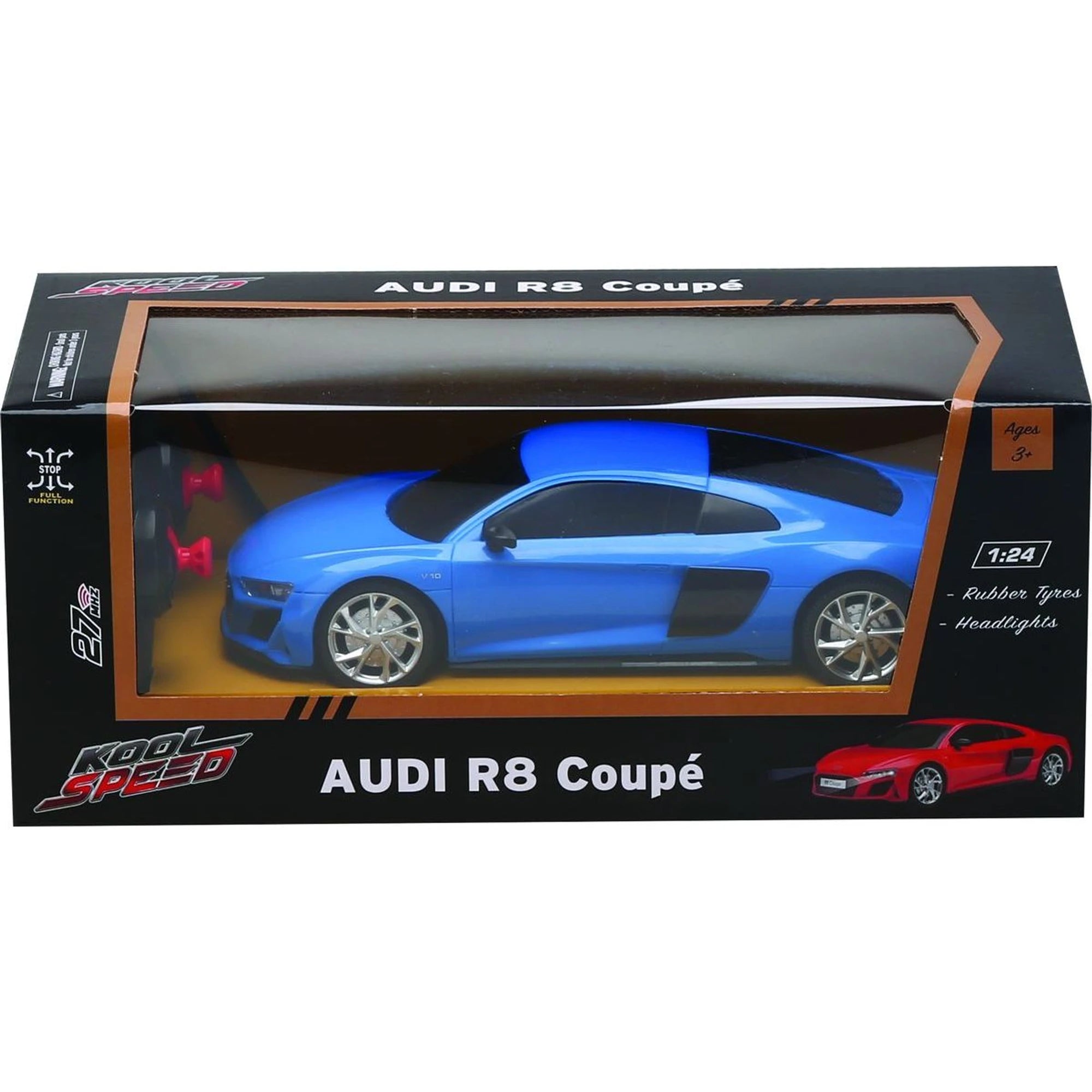 Audi R8 Coupé v modrém provedení je plastovým modelem sportovního vozu, který mohou závodníci ovládat na dálku – modré žihadlo připravené na domácí závody.