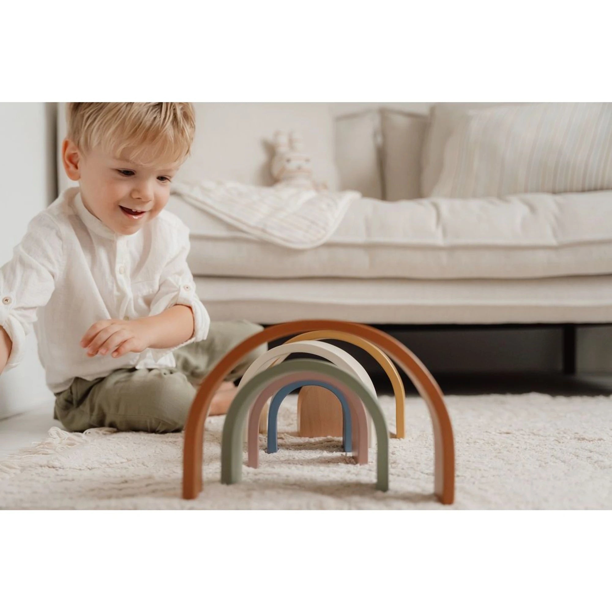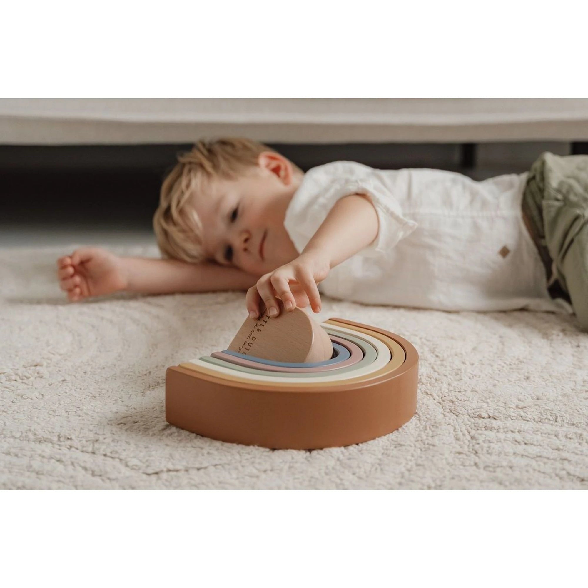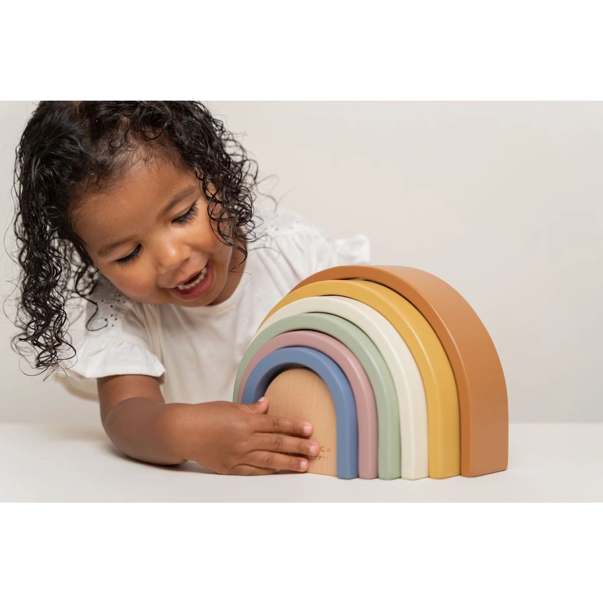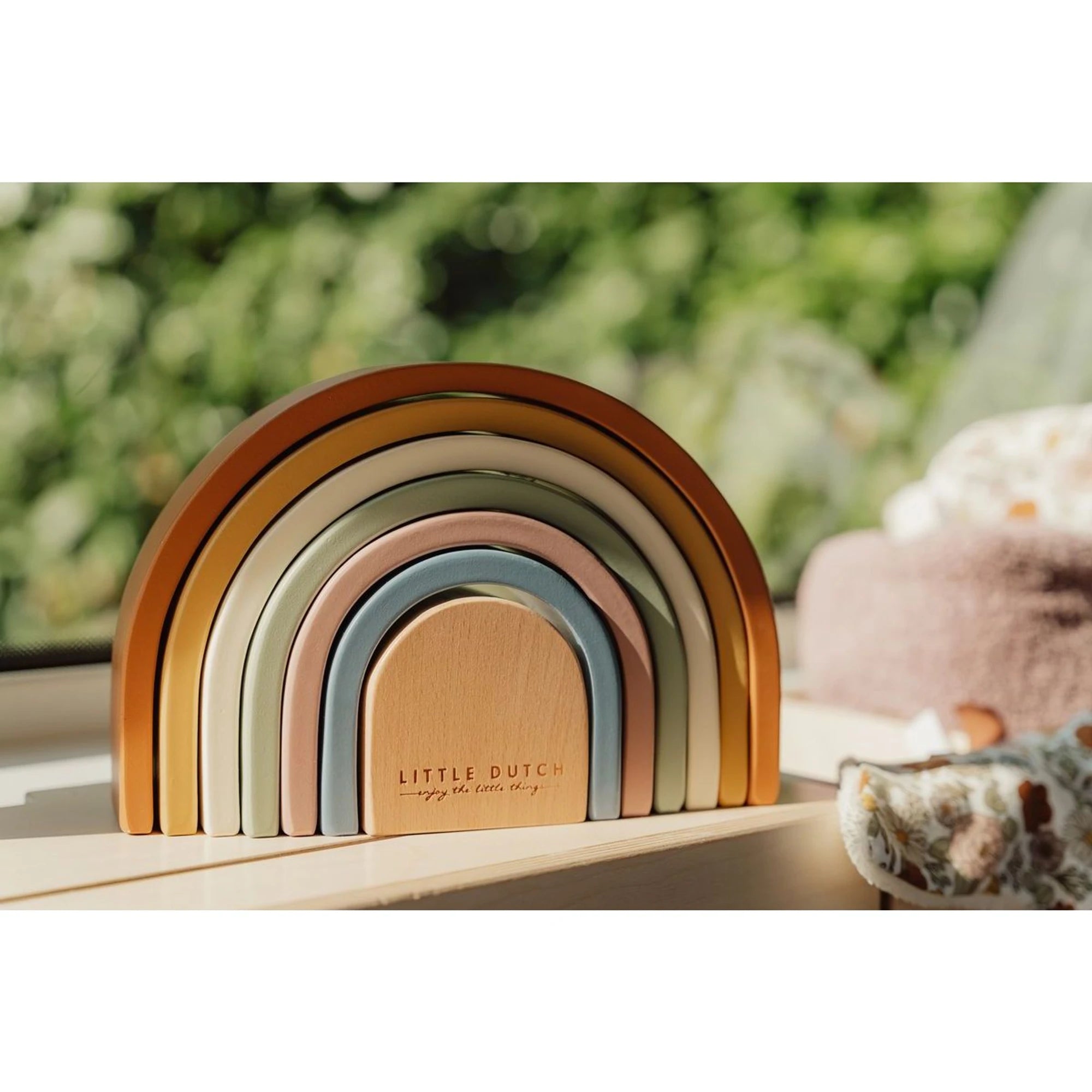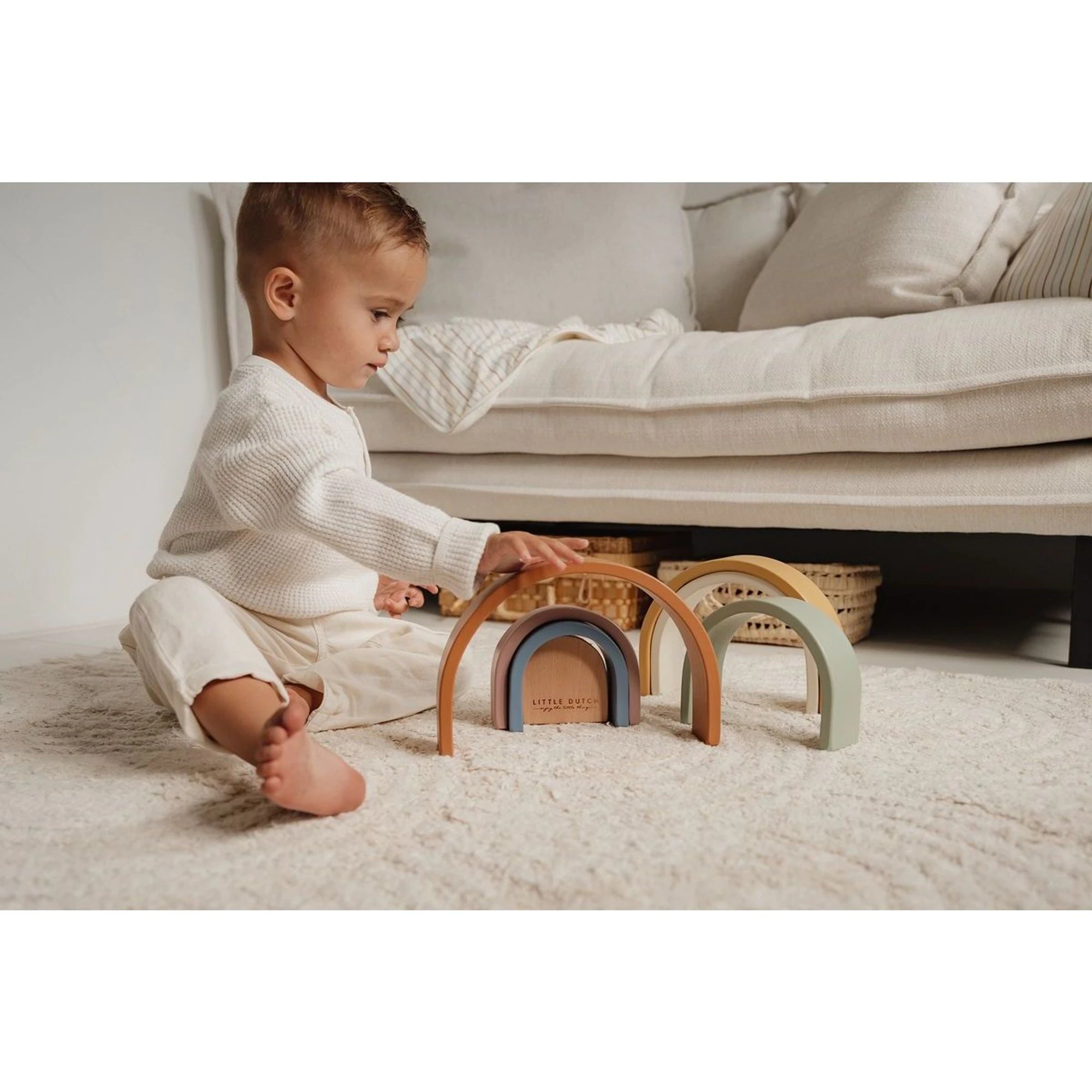 Umožní stavět tvary a objekty ve 3D, třeba železniční tunel, domeček pro malé panenky nebo most pro auta. Výchozí sestavení? Barevná duha, co rozzáří pokoj. Při výrobě hraček Little Dutch se hlídá kvalita i bezpečnost. V nabídce této značky jsou látkové panenky, dřevěné kostky, hudební a motorické hračky.